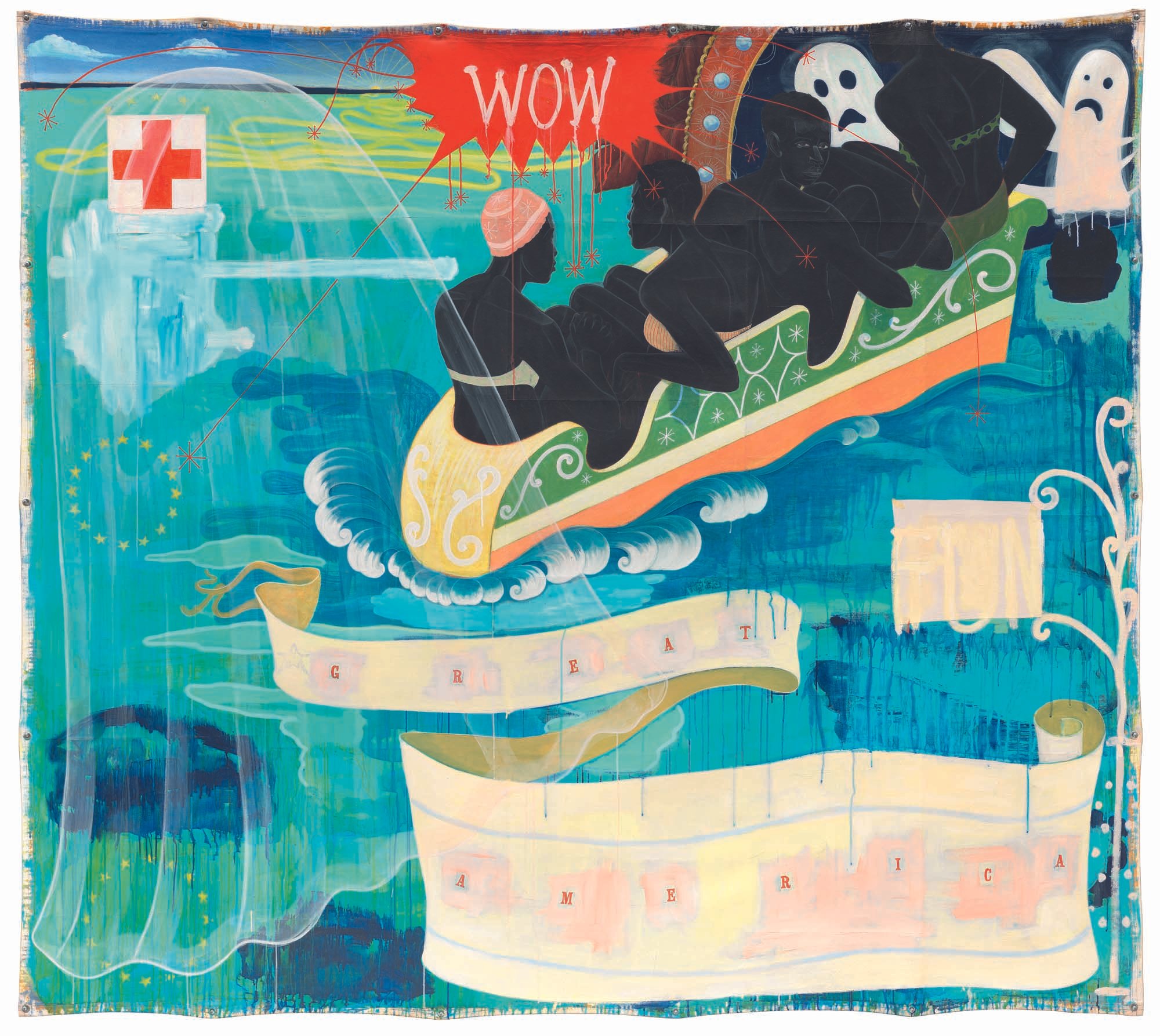 Kerry James Marshall, Terra Incognita, 1992. Acrylic, ink and paper collage laid on canvas with metal grommets, 239.4 × 189.5 cm. Private collection. © Kerry James Marshall. Image courtesy the artist and Jack Shainman Gallery, New York